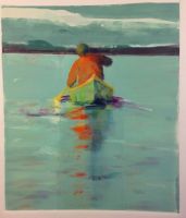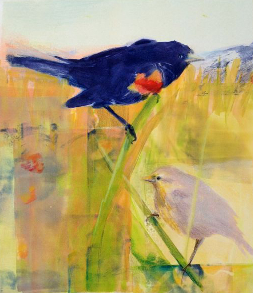 A monotype is a “one of a kind print”. A painting that is created in no more than a few hours on a flat Plexiglas or zinc plate, then transferred by press to paper. The image on the paper is the art.There are always questions to answer about monotypes; what is the process, why use the materials I use, why go through this multi-stepped, time constrained, risky process? The image reverses left to right and that can be confusing. There is a chance the ink will not transfer to the paper as intended; the dark colors may not be dense enough, the ink may slide, distorting a carefully painted shape. Why give up the control of painting an image directly on paper?