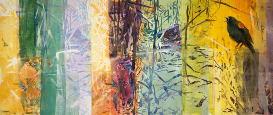 A plate, or more than one plate, can be printed several times on the same paper to produce a triptych (3 panel image) or diptychs ( 2 panels). The resulting image becomes somewhat narrative suggesting a shift in view or a progression of time. Some of these pieces are large for monotypes (though certainly not the largest) ranging from 24×40 inches to 30 x45. Usually I work on a panel a day, keeping the paper damp between printing. The most difficult things are to register (align) the image panels on the paper and to control the very large piece of paper while lining it up.